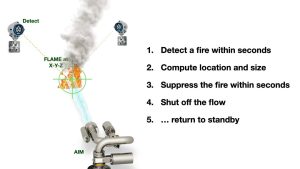 Traditional fire suppression systems—such as sprinklers, deluge systems, and even fire brigades—suffer from slow response times, poor targeting, and often excessive water damage. In contrast, FlameRanger detects, locates, tracks, and suppresses fires autonomously—typically in under 15 seconds—by combining high-precision robotic nozzles (aka “fire monitors” or “water cannons”) with industry-leading flame detection technologies, including IR3 flame detectors, thermal imaging cameras, video analytics and others.
